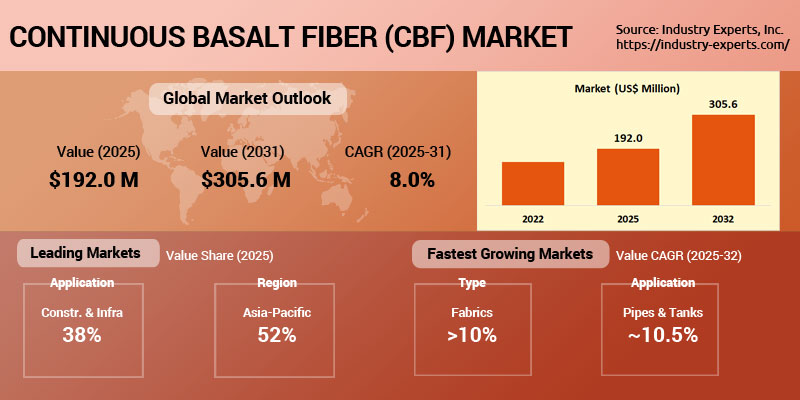 Industry Experts, Inc. has announced the publication of a new research report titled "Global Continuous Basalt Fiber (CBF) Market - Product Forms and Applications." According to the report, global revenues from continuous basalt fibers are expected to rise from around US$178 million in 2024 to nearly US$306 million by 2031, expanding at a CAGR of 8% during the forecast period 2025-2031.
