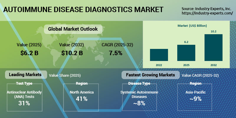 Industry Experts, Inc. has introduced its latest market research report, "Autoimmune Disease Diagnostics - A Global Market Overview," estimating that worldwide revenues will rise from US$6.2 billion in 2025 to US$10.2 billion by 2032, growing at a CAGR of 7.5% during 2025 to 2032. Market expansion is driven by the rising global prevalence of more than 100 autoimmune disorders, including rheumatoid arthritis, lupus, multiple sclerosis, and type 1 diabetes, coupled with heightened awareness, early testing initiatives, and technological advancements in immunoassays, biomarkers, and molecular diagnostics.