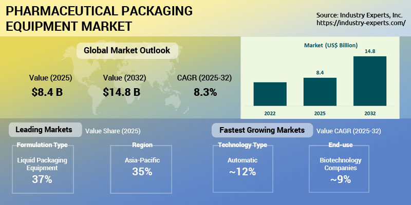 Industry Experts, Inc. has unveiled its latest market research report, "Pharmaceutical Packaging Equipment - A Global Market Overview", estimating that worldwide revenues will rise from US$8.4 billion in 2025 to US$14.8 billion by 2032, registering a CAGR of 8.3% during 2025-2032. Growth is fueled by surging production of biologics, vaccines, and personalized therapies, stricter quality and regulatory requirements, and rapid adoption of robotics, AI, and advanced vision systems that boost throughput while minimizing operational risks.