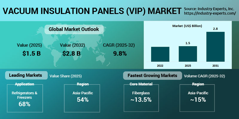 Industry Experts, Inc. has published comprehensive update of the research publication, "Vacuum Insulation Panels (VIPs) - A Global Market Overview," providing an in-depth assessment of market growth trends, competitive dynamics, and application developments shaping the global vacuum insulation panels (VIPs) industry. According to this report, global VIPs demand reached about US$1.5 billion in 2025. The market is expected to expand at a 13.6% CAGR in volume and a 9.8% CAGR in value during 2025-2032, reaching roughly 157 million square meters and US$2.8 billion by 2032, supported by accelerating appliance adoption, steady growth in pharmaceutical cold chains, and the gradual transition of VIPs from pilot-scale to broader commercial use in building applications.